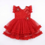 Stylish red net frock with layered frills, soft lining, and floral embellishments, perfect for parties, birthdays, and special occasions.