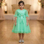 Elegant green net frock with soft tulle layers, puff sleeves, and bow detail, perfect for parties, birthdays, and festive occasions.